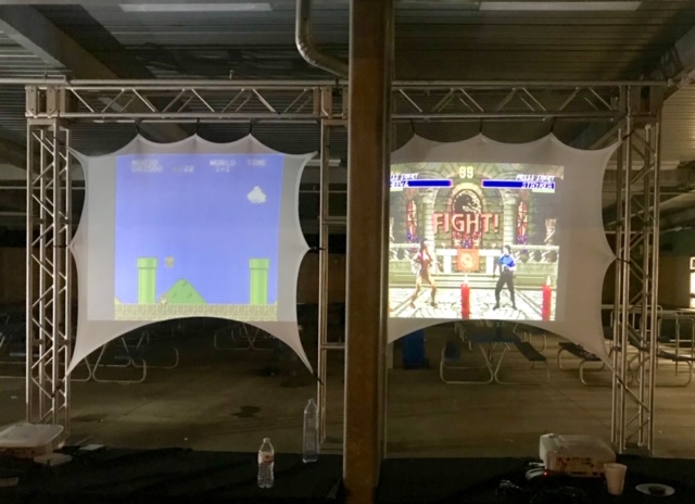 Giant Classic NES Gaming systems are a surefire way to get everyone involved and interacting. Our gaming systems are projected onto stretch screens that we set up on giant truss towers. Our gaming systems contain over 50 classic games that kids and adults will love! We also have in stock PlayStation, Nintendo Wii, and Xbox stations available to rent.